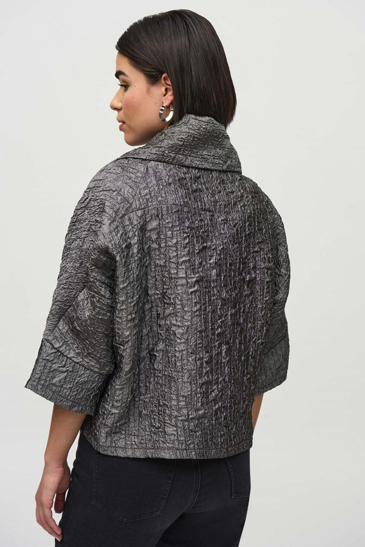 Tailor-made for the sophisticated woman, this textured woven jacquard jacket offers plenty of stylish touches to satisfy her inner fashion maven. An overlap collar, statement button front closure, and bias panels on the back come together to create a refined top layer.