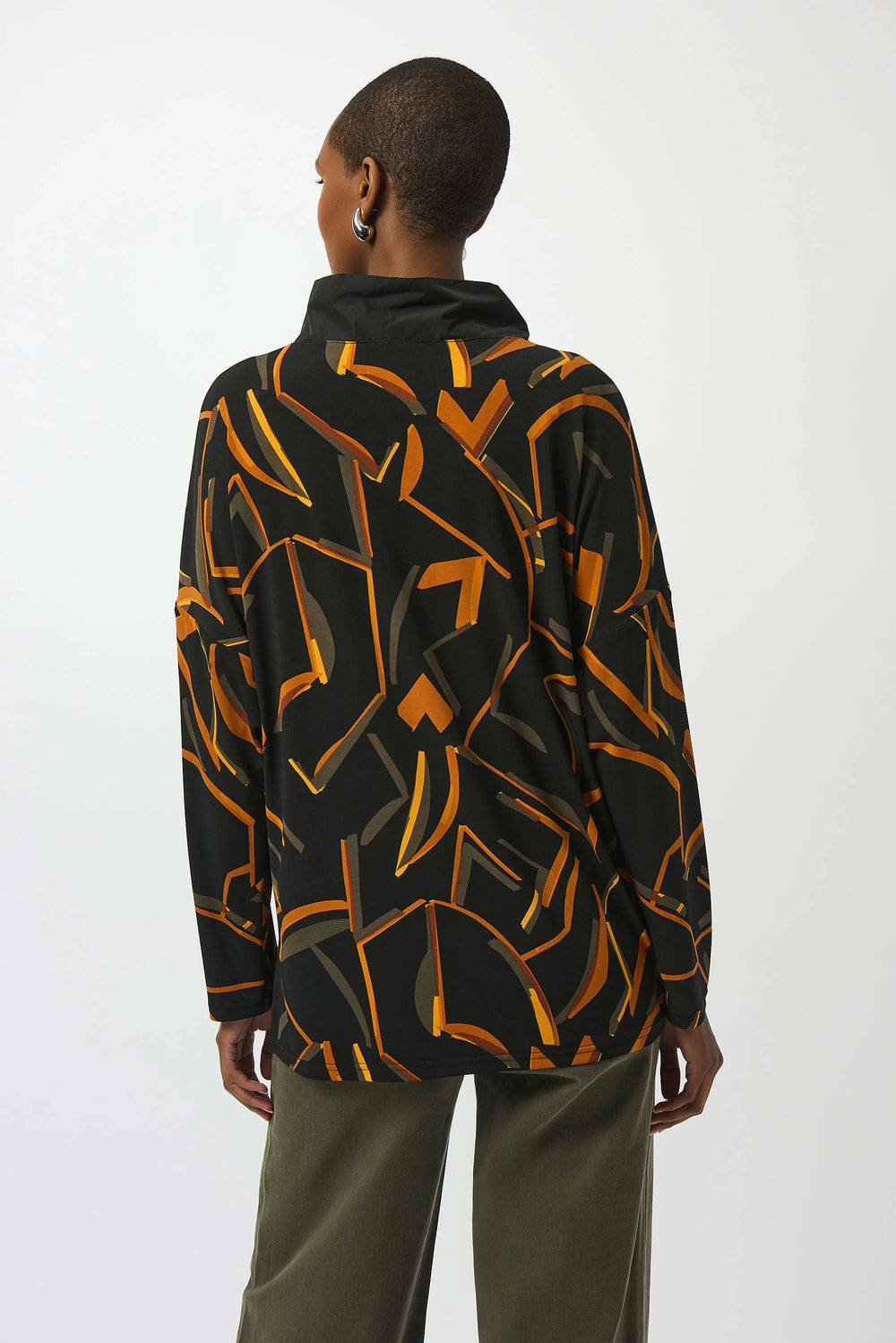 Bask in the undeniable elegance of this silky knit top boasting a captivating abstract print. The memory funnel collar with drawstrings brings a unique style and versatility to the piece. The long dolman sleeves complement the bold boxy silhouette and the front pocket adds extra charm.