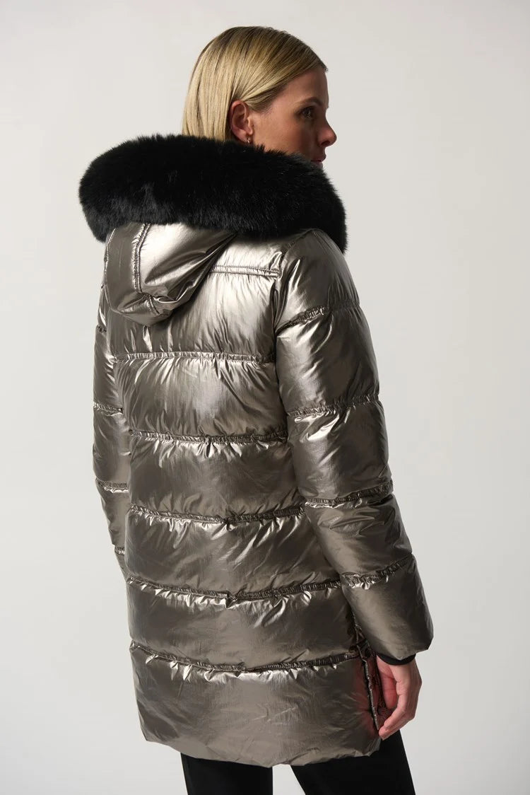 Add glamour and shine to the gloomy winter season with this gorgeous puffer coat. Brilliantly combining form and function, this jacket is made from high-end, durable woven material with faux fur accents. It comes with a hooded collar and long straight sleeves. This anything-but-boring lined coat is ready to keep you warm throughout the cold months.