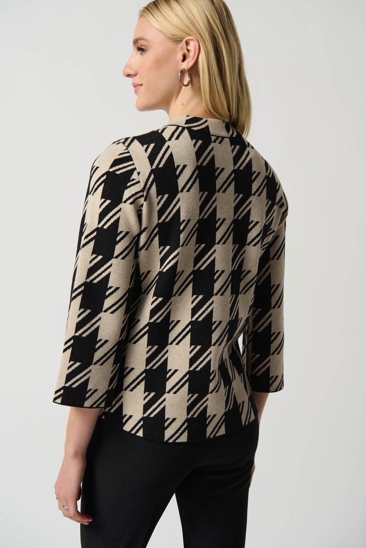Make a chic statement by donning this beautiful plaid jacket at the office. Designed in a jacquard sweater knit, it features an elegant mock neck and three-quarter sleeves. This eloquent cover-up can be worn on its own or with a silky blouse for a more feminine look.