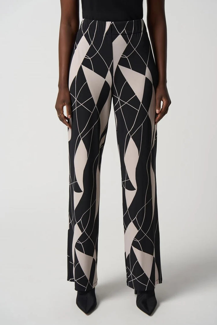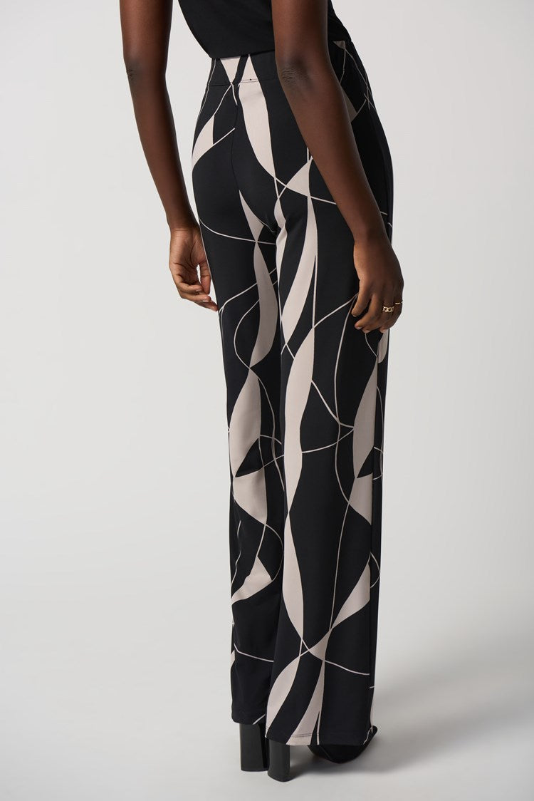 There's nothing like a great pair of pants to make you feel put-together and confident. Our abstract print wide-leg pants are just the thing to elevate your look. Made from a silky knit fabric with a hidden elastic waistband, these pants are incredibly comfortable. The fun, original print is perfect for adding colour to any outfit. And the faux-leather side inserts add a touch of luxury.