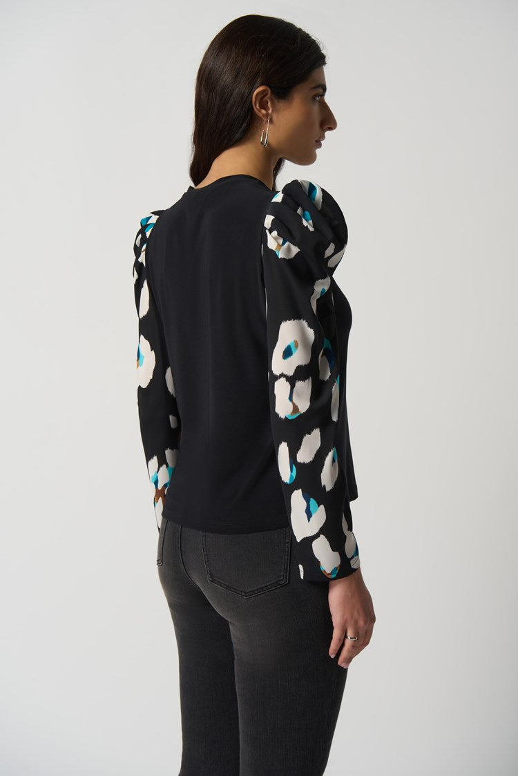 Our puff sleeve top is a chic and unique piece perfect for dressing up or down. The flattering fitted silhouette is accented by the long puffed sleeves, which feature a beautiful Georgette print inspired by the animal kingdom. The subtle scoop neckline is elegant and feminine, making this top a true chameleon piece that can be styled to suit any occasion.
