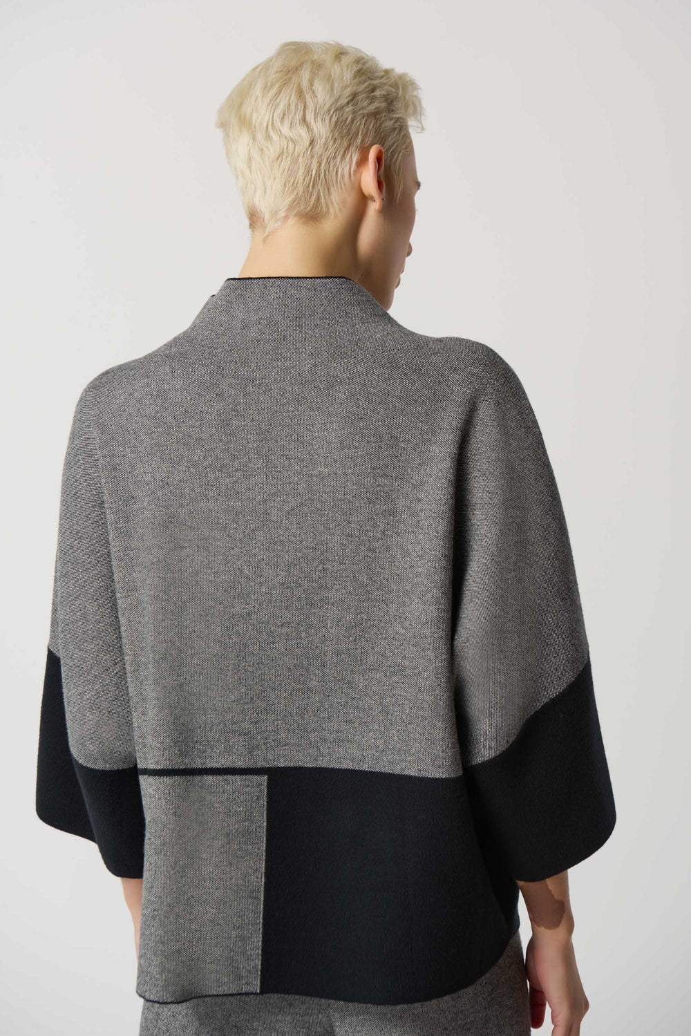 This modern colour-block top is crafted from a blend of knitwear and jacquard fabrics, providing a polished look that doesn't compromise on comfort. A funnel collar adds to its stately appearance, while three-quarter bell sleeves and a straight silhouette complete the look.