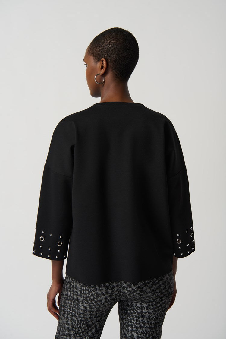 An exquisite addition to your wardrobe, this boxy top with a subtle scoop neck is versatile and feminine. The heavy knit fabric, dolman sleeves, rivet, and eyelet detail harmonize beautifully with a pencil skirt or pull-on pants.